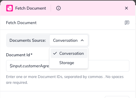 Conversation: Select this if the document was temporarily saved within the current workflow's conversation context. Remember, documents in conversation are only accessible within that specific conversation.