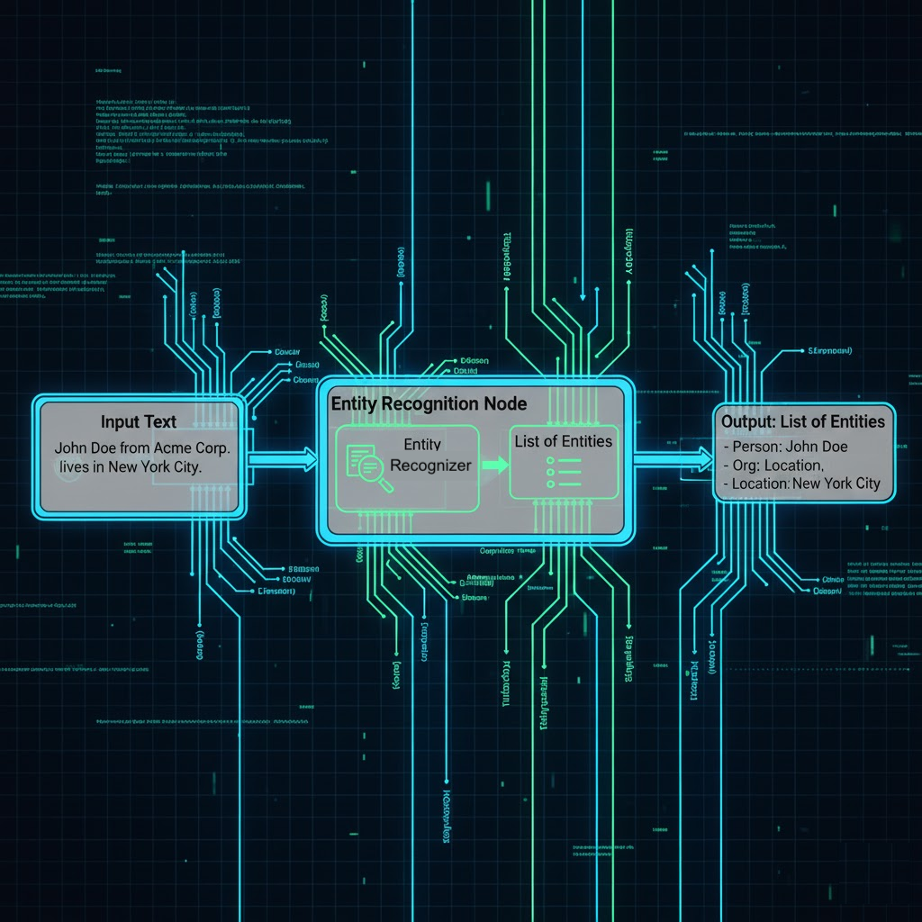 The Entity Recognition node identifies and classifies structured data (e.g., names, dates, contact information) from unstructured input, enabling downstream nodes to act on these extracted values.